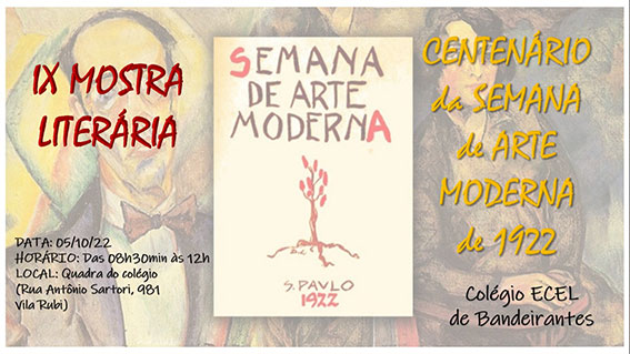 Nesta quarta-feira, dia 05, os alunos do Colégio ECEL terão uma grande oportunidade de acompanhar as apresentações, atividades e exposições da IX Mostra Literária, em homenagem à Semana de Arte Moderna de 1922. Um evento muito especial, fruto de um trabalho primoroso organizado pelos alunos, sob orientação das Jhuliene e Regiane, que ministram as disciplinas de Língua Portuguesa e Literatura no Ensino Fundamental e Ensino Médio. O trabalho, de acordo com a professora Jhuliene, é fruto de pesquisa de referenciais literários e aporte dos conteúdos programáticos estabelecidos no material didático do Sistema Positivo de Ensino.