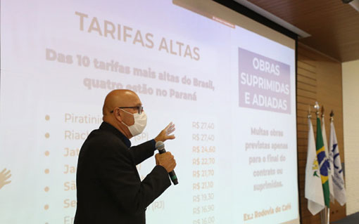 Durante o encontro, o deputado Luiz Claudio Romanelli (PSB), realizou uma apresentação comparando o contrato atual e a nova modelagem proposta pelo Governo Federal. De acordo com Romanelli, os modelos são semelhantes. Ele lembrou que quatro das dez praças de pedágio mais caras do Brasil estão no Paraná. Além disso, muitas obras previstas até o final do atual contrato não foram realizadas ou foram suprimidas, como duplicações de rodovias e construção de trevos e contornos. Para o deputado, o modelo híbrido proposto é uma concessão onerosa. Segundo Romanelli, o modelo híbrido representa um risco, já que o desconto está limitado em um valor entre 15 e 20%, o que pode representar no futuro uma tarifa com o valor que pode chegar a 80% dos preços praticados atualmente. “As atuais tarifas não podem ser o critério de desconto. Estes valores têm impacto na economia e competitividade do Estado”, avaliou. O deputado disse ainda que o modelo inclui o chamado degrau tarifário, que representa o aumento da tarifa compulsoriamente em até 40% após a realização das obras e duplicações. O parlamentar frisou também que, especificamente para na região Oeste, serão criadas quatro novas praças de pedágio. “As cidades de Cascavel, Toledo e Foz do Iguaçu estarão cercadas por pedágios”.