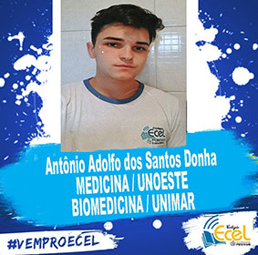 Começou a temporada de aprovações nos vestibulares dos alunos do Colégio ECEL. Só nesta semana, quatro alunos já tiveram os resultados positivos na busca por uma vaga na universidade. E detalhe: um deles, o aluno Antônio Adolfo dos Santos Donha, que passou em Medicina e Biomedicina, ainda está cursando o segundo ano do Ensino Médio. Ele prestou para testar os conhecimentos e ficou muito bem colocado.