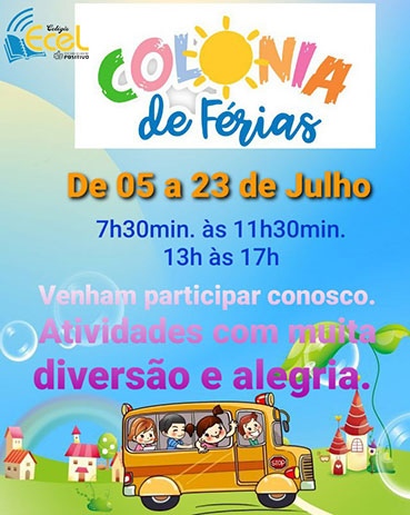 O Colégio ECEL promove entre os dias 05 e 23 de julho mais uma edição do projeto “Colônia de Férias”. O evento é direcionado aos alunos já matriculados, mas, também, aos que estão matriculando-se agora. Tradicionalmente, a instituição mobiliza esta ação de integração e socialização, com muitas atividades lúdicas e educativas. Para os novos alunos, esta é uma grande oportunidade para que possam conhecer os professores e colegas, de uma forma bastante divertida e dinâmica.
