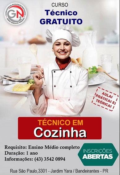 Estão abertas as inscrições para o Curso Técnico em Cozinha no CEEP (Centro Estadual de Educação Profissional) Ozório Gonçalves Nogueira, de Bandeirantes, com início das aulas em 2021. O prazo para realizar a matrícula é até dia 20 (sexta-feira) deste mês. Os interessados devem procurar a secretaria do CEEP, que fica na rua São Paulo, 3301, Jardim Yara, com telefone (43) 3542-0894, nos horários das 08h às 11h10min (segunda a sexta-feira) e das 19h às 21h (terças e quintas-feiras).