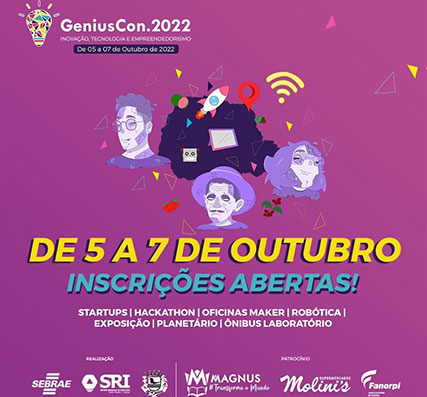 Tem início hoje (05) e segue até sexta-feira (07), a 7ª edição da GeniusCon, o maior evento de tecnologia, inovação e empreendedorismo do norte do Paraná. Este ano, a tradicional feira acontece de forma híbrida, com exposição, competições e atividades presenciais no Centro de Eventos de Jacarezinho e transmissão online de parte dos conteúdos, pelo YouTube. A participação é gratuita, mas foi preciso confirmar a inscrição que ocorreu até sábado (01).
