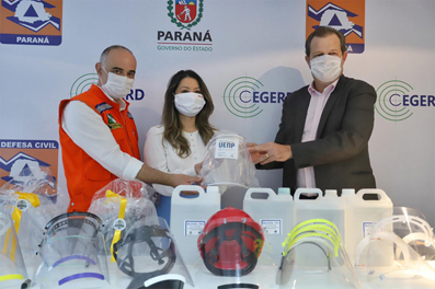 A UENP fez doação de protetores faciais para a Defesa Civil no último dia13. O superintendente de Ciência, Tecnologia e Ensino Superior, Aldo Bona, entregou os materiais de proteção produzidos pela UENP e por outras cinco IES paranaenses ao coordenador Estadual da Defesa Civil, tenente-coronel Fernando. O ato foi acompanhado pela primeira-dama, Luciana Saito Massa, e pela Superintendente Geral de Ação Solidária, Jeslayne Valente.