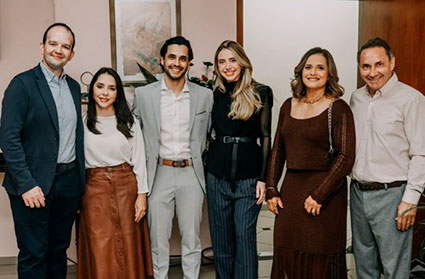 Filho do casal Dionísia e Pedro Silva, o médico bandeirantense passou a fixar vida profissional na Uniclínica (sendo um dos sócios da empresa) e também na saúde pública. Na foto, dr. Pedro Henrique ladeado pelos familiares, e reunidos para feliz ocasião: pais Dionisia e Pedro Silva; Tainá Zanetti (namorada); irmã Leandra e Luiz Andrade (cunhado); e Luiz Pedro (sobrinho). Sucesso nesta nova jornada!