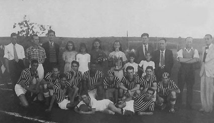 Foto (de 1940) do Guarani Esporte Clube de Bandeirantes. O terceiro da dir. para a esq, de terno escuro e de gravata, é o presidente do time, Joaquim Pinheiro de Freitas, avô do popular José Carlos Gonçalves (foto gentilmente cedida por Pedro Donizete Dias)