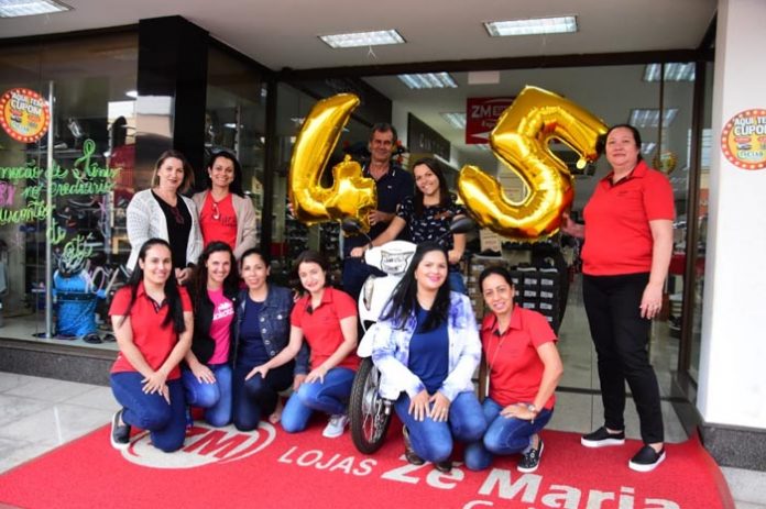 Para comemorar o aniversário de 45 anos, a ZM, loja de calçados e confecções em Bandeirantes, realizou promoção de uma motocicleta modelo Biz zero quilômetro. Através do sorteio realizado na segunda-feira (02) pela Loteria Federal, a feliz ganhadora foi a cliente Ana Karina de Oliveira Borges, que recebeu as chaves do prêmio das mãos do casal empresário, Márcia e Jucerlei Fontolan ‘Filinho’. Parabéns!