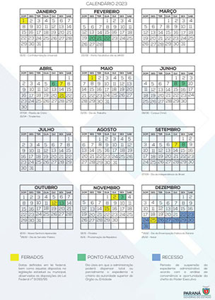 O governador Carlos Massa Ratinho Junior assinou na quarta-feira (14) o decreto 12.816/2022 que institui o calendário oficial de 2023. Ele estabelece os feriados e os dias de recesso e ponto facultativo para os órgãos e entidades da administração direta, autárquica e funcional do Poder Executivo.