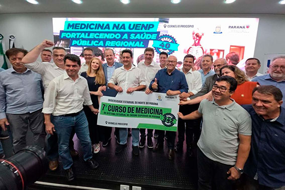 “Este é um momento histórico para o ensino superior do Paraná, especialmente para o Norte Pioneiro. Anunciamos o novo curso de Medicina da UENP e já no mês de março de 2026 teremos o vestibular para os alunos concorrerem a uma vaga. Acima de tudo, estamos realizando um sonho antigo da região, pois há mais de 30 anos se pedia a graduação em Medicina para Cornélio Procópio, e hoje conseguimos avançar nesse investimento”, afirmou Ratinho Junior.
