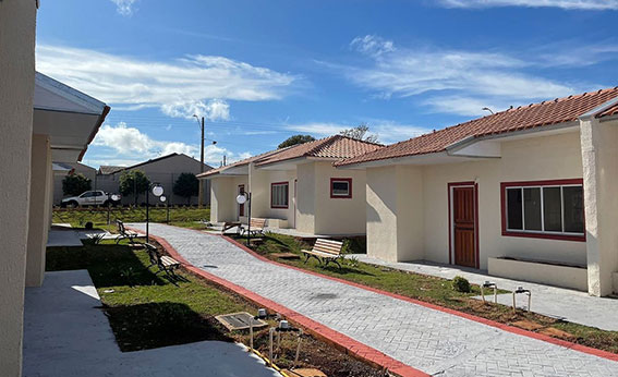 ESTRUTURA — Os moradores atendidos terão uma casa de 42 metros quadrados, com sala, cozinha, quarto e banheiro, além de uma lavanderia externa. Os imóveis foram projetados para abrigar um idoso ou um casal. A prefeitura também construiu um lago para atividades de lazer.