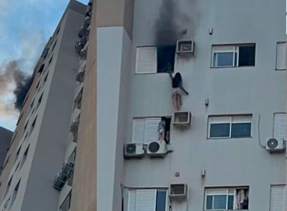 (Portal Catve.com) – A imagem angustiante mostra Juliane Suellem Vieira dos Reis, de 28 anos, do lado de fora do apartamento, apoiada sobre o ar-condicionado no 13º andar do Edifício João Batista Cunha, em Cascavel. Ela arriscou a própria vida para salvar a mãe e uma criança durante o incêndio que atingiu o prédio na manhã desta quarta-feira (15).