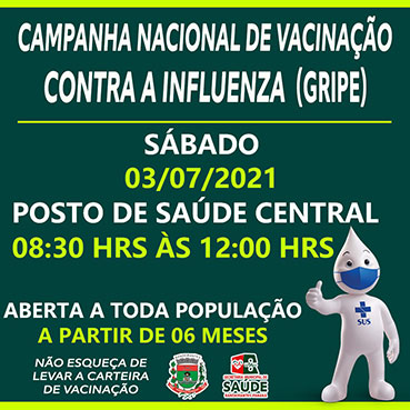 Acontece hoje, sábado (03), das 08h30min às 12h, Campanha de Vacinação contra a Gripe. Aberta a toda a população, com idade a partir de 6 meses, o público deve procurar o Posto Central, tendo em mãos a carteira de vacinas. A ação é promovida pela Prefeitura de Bandeirantes através da Secretaria de Saúde. Aqueles que tomaram a dose contra a Covid-19 devem verificar e esperar 15 dias da imunização.