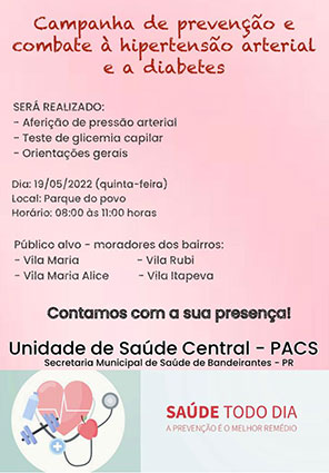 O dia 17 de maio é considerado o ‘Dia Mundial da Hipertensão’. Em comemoração à data, que visa a conscientização da população sobre a hipertensão (pressão alta), a Prefeitura de Bandeirantes e a Secretaria de Saúde farão uma campanha de prevenção e conscientização sobre a pressão alta e o diabetes. O evento será realizado no Parque do Povo, das 8h às 11h e terá aferição de pressão arterial, teste de glicemia capilar e orientações em geral. O público alvo dessa campanha são os moradores da Vila Alice, Vila Maria Alice, Vila Rubi e Vila Itapeva.