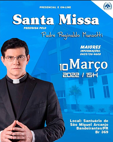 O padre Reginaldo Manzotti estará em Bandeirantes no próximo dia 10 (quinta-feira) e irá celebrar Santa Missa, às 15h, no Santuário São Miguel Arcanjo. A previsão é de que o religioso passará o dia no Município em visita ainda a Gruta Nossa Senhora de Lourdes, a Cruz mais alta sobre o monte, ao Santuário Santa Terezinha do Menino Jesus e da Sagrada Face, como também outros pontos turísticos da cidade. Os santuários fazem parte da Rota do Rosário.