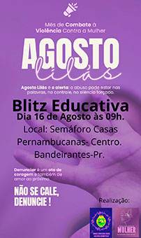 A Procuradoria Municipal da Mulher de Bandeirantes, em parceria com o Poder Legislativo e Patrulha Maria da Penha da Polícia Militar do Estado do Paraná, realiza no próximo sábado (16) a 1ª Blitz Educativa em alusão ao Agosto Lilás, mês de conscientização pelo fim da violência contra a mulher.