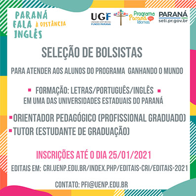 A Coordenação Estadual do Programa Paraná Fala Idiomas abriu editais para seleção de bolsistas com vagas para orientadores pedagógicos e também tutores/professores, que atenderão aos alunos selecionados pelo Programa Estadual ‘Ganhando o Mundo’. O Programa levará à Nova Zelândia 100 alunos do Ensino Médio da rede pública para intercâmbio no segundo semestre deste ano.