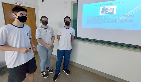 De acordo com o professor, os alunos trouxeram exemplos / tipos de manifestações de bullying (ameaças, intimidação, humilhação, exclusão, discriminação, exposição de forma a desconstruir a imagem do outro, violências físicas), levantados durante a pesquisa. Durante a apresentação expositiva, os alunos utilizaram slides e materiais ilustrativos.