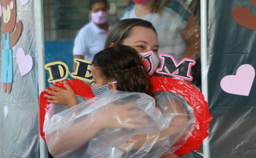 “O Projeto ‘Cortina do Abraço’ tem o intuito de demonstrar e resgatar o amor através do abraço dos professores e alunos, que estão com o distanciamento social, perante a situação do vírus Covid-19. Com isso, podemos obter o vínculo ao se aproximar das crianças, demonstrando muito carinho e afeto. Foi um dia muito alegre em rever os alunos, a emoção de ver eles de perto, que alegria ter esse breve momento de contato e de interação com as crianças. Foi emocionante para todos”, definiu a diretora Luciana de Fátima Luiz.