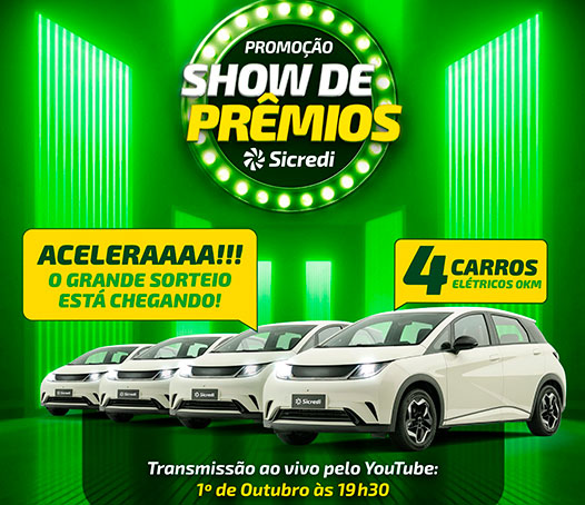 Nesta quarta-feira, 1º de outubro, a Sicredi Paranapanema Serrana PR/SP/RJ promove o grande sorteio da Promoção Show de Prêmios 2025, que vai contemplar associados com quatro carros elétricos 0 km.