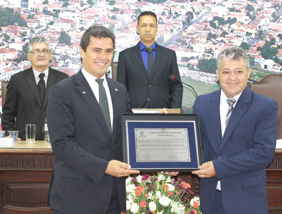 O deputado federal Diego Garcia recebeu no último dia 01, o Título de Cidadão Honorário do município de Jacarezinho. A honraria foi entregue através do Decreto Legislativo 03/2018 de autoria do vereador Sidnei Francisquinho, o Chiquinho Mecânico. A Sessão Solene contou com os vereadores Luiz Carlos do Nascimento (Presidente em Exercício), André de Sousa Melo, Diogo Augusto Biato Filho, Edílson da Luz e o autor do projeto Chiquinho Mecânico. Também estiveram o prefeito Sérgio Eduardo e a vice prefeita Cássia Faleiros.