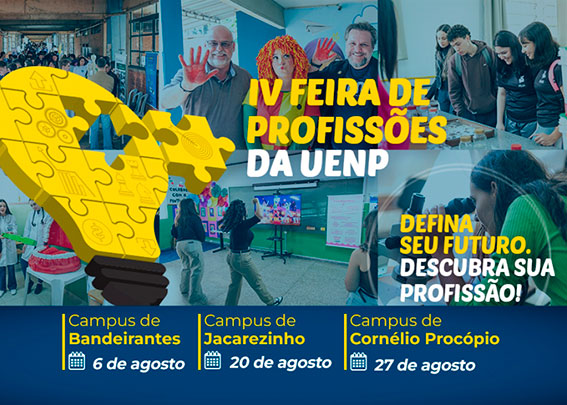 A Universidade Estadual do Norte do Paraná (UENP), através da Pró-Reitoria de Graduação, colegiados de curso e direção de Campi, realizará, nos dias 6, 20 e 27 de agosto, a 4ª edição da Feira de Profissões da Instituição. Neste ano, cada Campus organizará seu evento. O objetivo da Feira é apresentar para o visitante as áreas de conhecimento abrangidas pela UENP, os cursos de graduação e pós-graduação, as formas de ingresso, além das ações de pesquisa e extensão, a fim de oportunizar a escolha de futuros caminhos profissionais.
